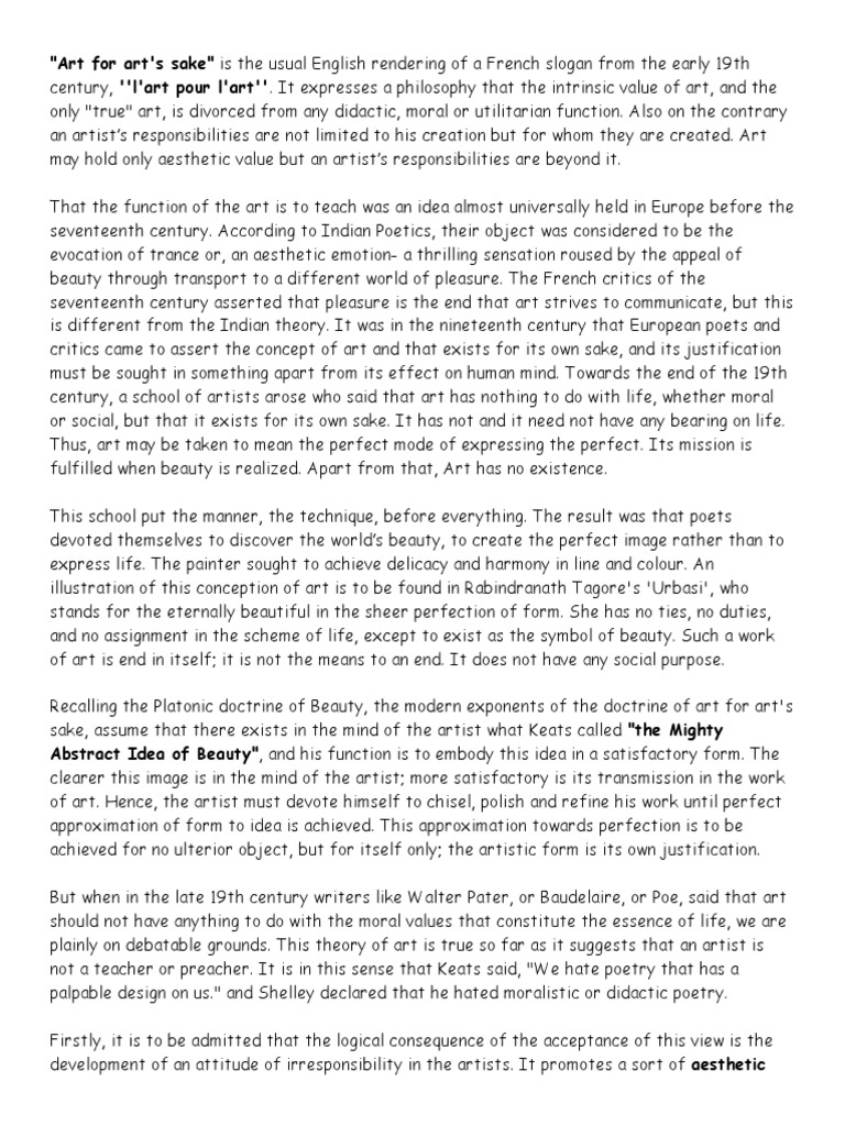 Art for Arts Sake pure art term designating a number of aesthetic. Art for Arts sake boldly states that the success of art cannot be measured by its accuracy or the effectiveness with which it tells a story or imbibes a moral. This study builds on existing arts res.